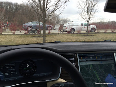 On the appointed day, a valet from the Cleveland Service Center (the closest full service center to Pittsburgh at the time) arrived at my workplace with "Elon".  We chatted a few minutes, traded fobs and I was back at work while he drove my car back to Cleveland.  Normally they'd use a flatbed truck but I guess it was already shuttling a car from even farther away that particular morning.  No matter.  As long as nothing breaks 150 miles or so out of warranty!  Schedule conflicts would mean that we ended up with the loaner for a FULL WEEK, so "Elon" and I got to know each other pretty well and I had fun playing with the new features-- completely unaware of how far Tesla would push this tech.